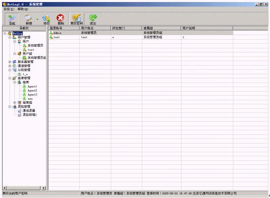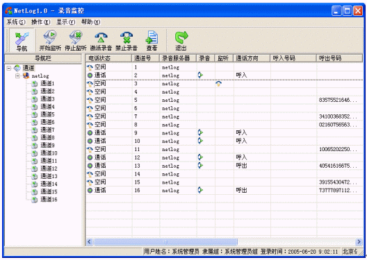 Netlog系統(tǒng)中控制臺(tái)是一個(gè)統(tǒng)一配置和管理的平臺(tái),可以部署在網(wǎng)絡(luò)內(nèi)的任意一臺(tái)主機(jī)上,各個(gè)功能模塊都可以單獨(dú)工作,也可以同時(shí)使用,控制臺(tái)所有模塊可以通過(guò)系統(tǒng)導(dǎo)航(ToolBar)來(lái)引導(dǎo)啟動(dòng)。用戶可以通過(guò)控制臺(tái)操作網(wǎng)絡(luò)上所有記錄服務(wù)、數(shù)據(jù)服務(wù)和文件服務(wù)?刂婆_(tái)作為最終用戶終端可以完成用戶的所有操作,設(shè)置每個(gè)服務(wù)器甚至每個(gè)通道的屬性、執(zhí)行各種用戶操作、指定服務(wù)的工作方式、錄音查詢、錄音管理、輸出報(bào)表、排班等?刂婆_(tái)根據(jù)用戶權(quán)限的不同限定用戶的操作,更好的保障了系統(tǒng)的運(yùn)行和語(yǔ)音記錄文件的安全。