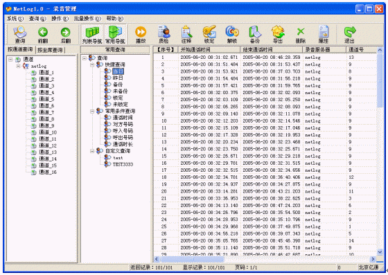 主要是對(duì)錄音進(jìn)行管理,分為錄音查詢和錄音操作兩大部分。錄音查詢除了提供常規(guī)的按條件組合查詢外,還提供了人性化的常用查詢,系統(tǒng)已經(jīng)內(nèi)置了很多常用查詢,例如:當(dāng)日查詢,您只要直接選擇當(dāng)日查詢,就可以馬上開(kāi)始查詢當(dāng)日的所有錄音,減少您每次輸入查詢條件的工作量,并且還可以靈活的自定義常用查詢,充分滿足您的查詢要求。錄音操作提供了方便快捷的操作方式。批量數(shù)據(jù)的處理能力可以讓用戶以最快的速度從煩瑣的工作中解脫出來(lái)。詳細(xì)的記錄信息可以滿足所有用戶的要求,特定信息的加入可以滿足特殊行業(yè)的使用,如呼叫中心行業(yè)、服務(wù)臺(tái)、傳呼臺(tái)等。