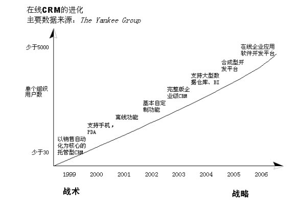 2005年是全球CRM市場(chǎng)發(fā)生天翻地覆變化的一年,CRM市場(chǎng)已達(dá)到120億美元規(guī)模(根據(jù)AMR數(shù)據(jù))。傳統(tǒng)應(yīng)用軟件商們紛紛涉足應(yīng)用軟件托管,但三心二意。傳統(tǒng)應(yīng)用軟件巨頭Siebel,因客戶選擇其托管CRM而通常不會(huì)再買其高利潤(rùn)的傳統(tǒng)CRM產(chǎn)品,其在市場(chǎng)推廣力度和技術(shù)服務(wù)水平上遠(yuǎn)不如Salesforce,Siebel最后被Oracle收購(gòu)。在Peoplesoft