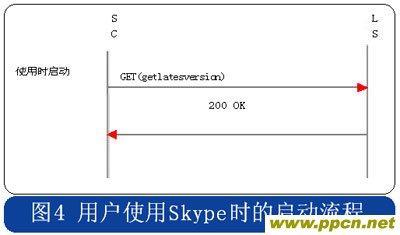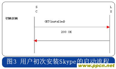 Skype的用戶(hù)終端啟動(dòng)時(shí),采用HTTP協(xié)議連接到注冊(cè)服務(wù)器,用戶(hù)初次安裝的啟動(dòng)流程中攜帶“installed”的參數(shù),使用時(shí)啟動(dòng)流程則在消息中攜帶“getlatestversion”參數(shù),具體流程分別見(jiàn)圖3和圖4。