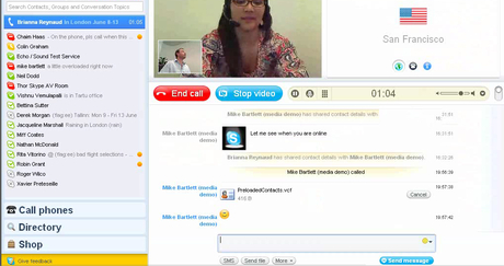 顯著的一個(gè)大改變是,軟件界面變成了全屏,而視頻窗口又占據(jù)了絕大部分版面。在視頻中還有“畫中畫”的功能,小的畫面可以任意移動(dòng)?梢哉fskype從一部網(wǎng)絡(luò)電話,變成了一部網(wǎng)絡(luò)可視電話;蛘,好像感覺是在視頻聊天室中一樣。