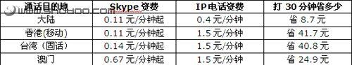 3G手機(jī)用Skype和固定電話通話的資費(fèi)與傳統(tǒng)IP電話相比如何呢?見(jiàn)下表: