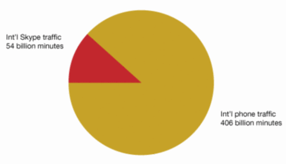 數(shù)據(jù)顯示,2009年全球國際長途電話通話時長為4060億分鐘,其中Skype至Skype的通話時長為540億分鐘。TeleGeography表示,過去25年,通過電話機(jī)的國際長途電話通話量年增長率為15%,但過去幾年中這一增長率有所下降。過去兩年,這類國際長途電話通話量每年增長率僅為8%。