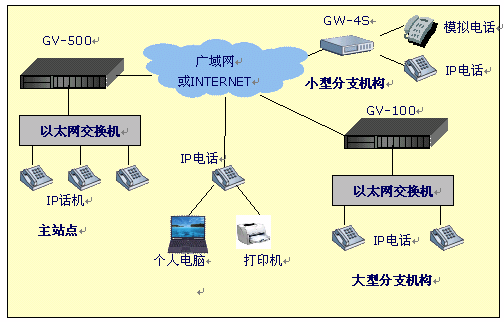 - 分公司:選用一臺(tái)4口網(wǎng)關(guān)設(shè)備,接入到互聯(lián)網(wǎng)絡(luò),通過公共的IP交換中心建立起呼叫連接,實(shí)現(xiàn)打電話的功能。模擬了通過網(wǎng)關(guān)設(shè)備接入PBX(電話程控交換機(jī)),如果其它分部也要接入PBX,與此情況類似。(詳見后面的"撥號(hào)示例")
