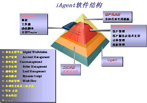 iAgent3.0從軟件內(nèi)部的結(jié)構(gòu)體系上加以突破,統(tǒng)一開放的應(yīng)用平臺上組合功能強(qiáng)大的二次開發(fā)工具,并在此基礎(chǔ)上加以針對行業(yè)而特別設(shè)計的功能模板。更好的適應(yīng)了企業(yè)處理流程的多樣化和需求的復(fù)雜化,并為企業(yè)高速的業(yè)務(wù)增長和功能需求增長帶來極大的拓展空間。軟件結(jié)構(gòu)如下圖所示: