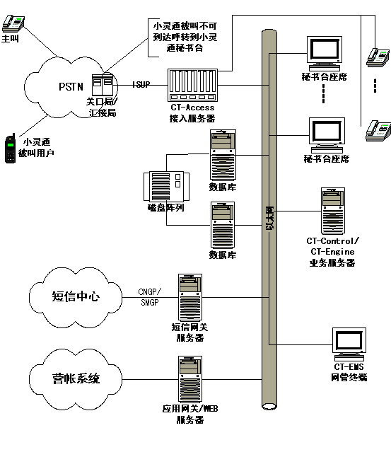 如上圖所示,小靈通秘書臺網(wǎng)絡(luò)拓?fù)鋱D,上圖中紅色虛線的左邊為運(yùn)營商部分,紅線是接口部分, 紅色虛線的右邊是增加的小靈通秘書臺設(shè)備和工程實(shí)施部分。首先需要在小靈通網(wǎng)絡(luò)的關(guān)口局或者匯接局設(shè)置被叫不可到達(dá)(關(guān)機(jī)、忙、不在服務(wù)區(qū))呼叫前轉(zhuǎn),通過ISUP協(xié)議呼叫到小靈通秘書臺的CT-Access接入服務(wù)器,提取主叫號碼、被叫號碼、原被叫號碼,同時給主叫播放語音,"您撥的用戶無法接通,您可以選擇失話復(fù)得業(yè)務(wù),本業(yè)務(wù)每條短信收費(fèi)0.1元,漏話提示請按1號鍵,短信回叫請按2號鍵,轉(zhuǎn)人工請按9號鍵"。然后根據(jù)主叫的響應(yīng)選擇提供服務(wù)(業(yè)務(wù)流程見第3章)。小靈通秘書臺的業(yè)務(wù)部分由CT-Control/CT-Engine業(yè)務(wù)服務(wù)器和數(shù)據(jù)庫服務(wù)器組成,另外包括人工臺和短信網(wǎng)關(guān),短信網(wǎng)關(guān)通過CNGP(網(wǎng)通)、SMGP(電信)和短信中心網(wǎng)關(guān)接口,實(shí)現(xiàn)短信發(fā)送功能。業(yè)務(wù)網(wǎng)關(guān)和WEB服務(wù)器為可選部分,根據(jù)業(yè)務(wù)需要選配。