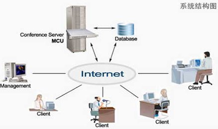經(jīng)過種種測(cè)試,最后選定視維Super-V視頻會(huì)議系統(tǒng),山大聯(lián)潤研發(fā)的視維視頻會(huì)議系統(tǒng)由服務(wù)器端軟件和客戶端軟件兩部分組成。其中安裝服務(wù)器端軟件的PC服務(wù)器必須有公網(wǎng)固定的IP地址;有較好的網(wǎng)絡(luò)帶寬條件,以保證正常的音視頻信號(hào)的傳輸。所有會(huì)議成員都需要在其個(gè)人計(jì)算機(jī)上安裝客戶端軟件,可以根據(jù)具體情況接入IP網(wǎng)絡(luò)。視維Super-V視頻會(huì)議系統(tǒng)將所參會(huì)人員通過IP網(wǎng)絡(luò)連接起來,提供音頻、視頻以及數(shù)據(jù)協(xié)作等通訊服務(wù)。其網(wǎng)絡(luò)拓?fù)鋱D如下: