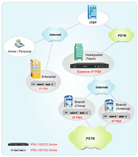 Essence IPBX系列可以注冊者之形式注冊于其他SIP協(xié)定伺服器上,如ITSP運(yùn)營平臺(tái),或是分公司之小型IP PBX注冊至總公司之大型IP PBX ,均可透過Internet 將話務(wù)無限延伸。