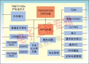 TI提供全面的VoIP解決方案,覆蓋IP電話、家庭網(wǎng)關(guān)、電信級網(wǎng)關(guān)以及VoADSL和VoCable。針對企業(yè)級IP電話需求,TI提供了多種解決方案,其中TNETV1050/TNEV1055的SoC方案基于TI的TMS320C55x DSP系列的可編程DSP和增強(qiáng)的32位MIPS內(nèi)核。它使用先進(jìn)的系統(tǒng)架構(gòu),在提供高性能低功耗的同時,兼顧系統(tǒng)的可擴(kuò)展性,還包括豐富的外設(shè)接口,滿足設(shè)計企業(yè)級電話系統(tǒng)的要求。