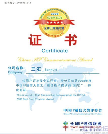 9月19日,在上海盛大舉行的CIPCC中國IP通信大會(huì)上,杭州三匯摘取了CIPCA 2008年國內(nèi)最佳語音板卡提供商大獎(jiǎng),體現(xiàn)了杭州三匯在國內(nèi)語音卡領(lǐng)域的絕對(duì)領(lǐng)導(dǎo)和優(yōu)勢地位。