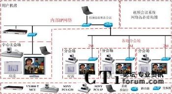 本次系統(tǒng)根據(jù)各會場不同規(guī)模的應用,共采用了1臺Sony PCS-G50P、29臺Sony PCS-1P,每臺終端還配置了用于PC圖文傳輸?shù)碾p流盒,共30個。多點控制單元(MCU)采用超然的VmediaX VX4000-T(32個點)。系統(tǒng)拓撲圖如下: