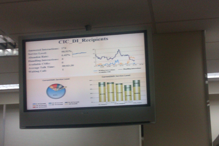 呼叫中心在三樓,在這里有先進(jìn)的軟件系統(tǒng)監(jiān)測出電話呼入、呼出量、棄線率、平均通話時長等各類信息并在電視屏幕上實時顯示。據(jù)索尼(中國)顧客互動中心負(fù)責(zé)人介紹,這是采用的COPC管理體系。