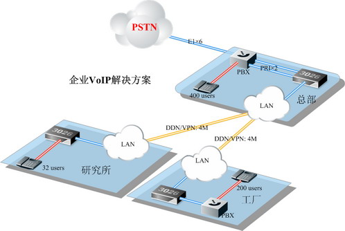而目前網(wǎng)絡(luò)環(huán)境的改善,ADSL、寬帶的接入方式越來(lái)越普及,許多企業(yè)以及他們的分支機(jī)構(gòu)已經(jīng)通過(guò)各種方式接入Internet,鑒于Internet便宜的使用費(fèi)用,廣泛的普及范圍,基于VPN/DDN的VOIP解決方案,徹底解決了上述問(wèn)題,彌補(bǔ)了傳統(tǒng)電話網(wǎng)關(guān)的不足,且用戶可以根據(jù)自己需要,不斷擴(kuò)展IP語(yǔ)音端口,"邊發(fā)展邊升級(jí)",經(jīng)濟(jì)靈活,是一套性價(jià)比非常高的方案。