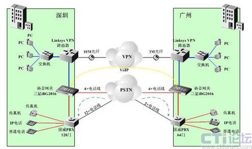 A公司總部設(shè)在深圳,在廣州有分公司。深圳總部目前已有10M光纖到樓作為總出口帶寬,已安裝1臺(tái)支持VPN功能的Linksys路由器;語(yǔ)音方面,已申請(qǐng)了16條電話線,并安裝1臺(tái)國(guó)威128門PBX;廣州也引入了3M光纖作為出口帶寬,和6條電話線作為PSTN外線,已安裝1臺(tái)支持VPN功能的Linksys路由器和1臺(tái)國(guó)威64門PBX。深圳、廣州兩地公司已建立了VPN隧道,以提供有安全保障的數(shù)據(jù)網(wǎng)絡(luò)平臺(tái)。
