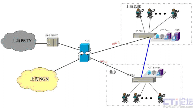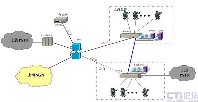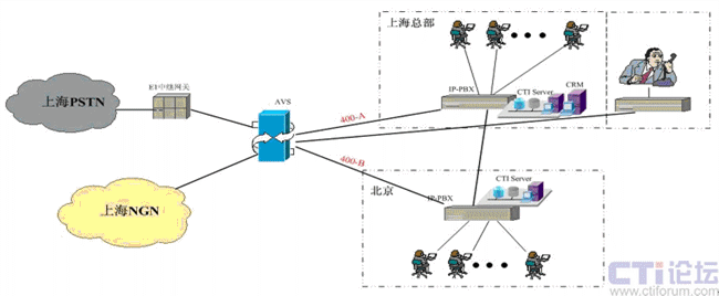 在上海采用傲威通信的AVS軟交換平臺實現VoIP呼叫系統(tǒng)的主叫識別,決定呼叫路由的選定。在上海和北京分別建設IP-PBX和CTI呼叫系統(tǒng),在各辦事處或分公司可根據選擇是否要建設坐席或普通電話系統(tǒng),所有節(jié)點的呼入呼出統(tǒng)一從上海出口實現出入。