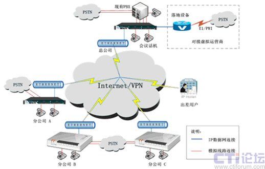 利用公共寬帶網(wǎng)絡(luò),實現(xiàn)總公司和各個分公司之間IP電話互通功能,從而免除總公司和各個分公司內(nèi)部溝通的通訊市話和長話費用。