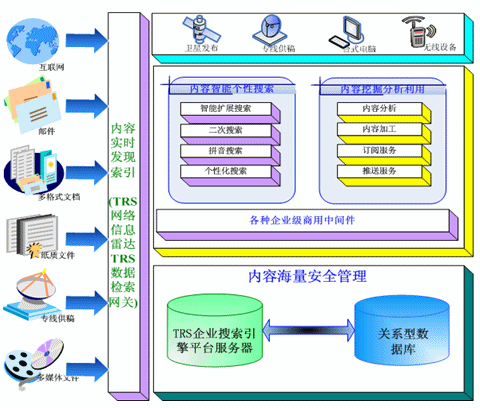 TRS公司推出的企業(yè)搜索引擎解決方案,利用TRS公司多年來(lái)自主開(kāi)發(fā)的TRS Database Server作為企業(yè)搜索引擎服務(wù)的平臺(tái)?梢詫㈦娦牌髽I(yè)內(nèi)外部多種格式、多種介質(zhì)形態(tài)、多種存儲(chǔ)方式的內(nèi)容信息,以實(shí)時(shí)的方式將這些信息進(jìn)行索引。并且在索引的過(guò)程中力求能夠做到準(zhǔn)確,并配合以相關(guān)智能語(yǔ)言技術(shù)做信息的去重、自動(dòng)標(biāo)引等能力。其框架如圖: