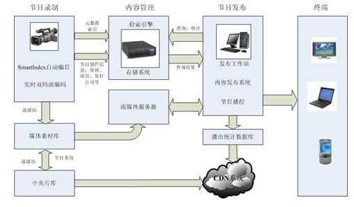 農(nóng)村黨員干部現(xiàn)代遠(yuǎn)程教育系統(tǒng)是涉及多個(gè)層面的系統(tǒng)工程,基礎(chǔ)設(shè)施建設(shè)內(nèi)容主要包括:節(jié)目制作平臺(tái)、中心資源庫(kù)、節(jié)目發(fā)布平臺(tái)、信息管理系統(tǒng)、接收終端等部分。該方案基于全球最成熟的寶麗星通軟件(北京)有限公司研發(fā)的寶麗通流媒體支撐平臺(tái),具備在現(xiàn)有網(wǎng)絡(luò)基礎(chǔ)架構(gòu)上開展豐富多彩的面向農(nóng)村黨員和農(nóng)民用戶的視聽(tīng)類的綜合信息服務(wù)。系統(tǒng)結(jié)構(gòu)如下圖所示。