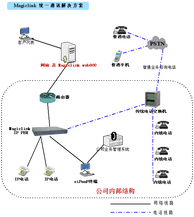 Magiclink統(tǒng)一通訊解決方案利用我公司的全線產(chǎn)品,將企業(yè)的:網(wǎng)站、內(nèi)部電話、呼叫中心、客戶管理系統(tǒng)完整的整合在一起。通過這種整合起到了:降低成本、增加營銷手段、提升資源利用率的特點(diǎn)。