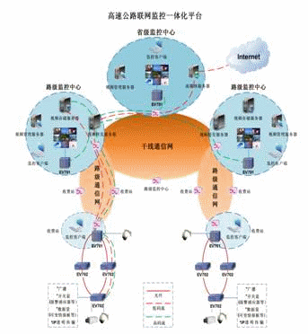 采用H.264編碼標(biāo)準的EV702外場綜合接入設(shè)備,將原來外場分散的攝像頭、快球、云臺、可變情報板、報警感應(yīng)器等設(shè)備融為一體,同時也支持MPEG編碼標(biāo)準的視音頻接入。EV702配備光纖通信板卡,不需要光端機,可以直接連接光纖,進行遠距離。通過EV702連接成環(huán),并且具有自愈功能?蛇M行集中式(路級監(jiān)控中心)、分布式(各級監(jiān)控中心)存儲。路級中心、區(qū)域中心、省級中心分布式多級監(jiān)控,由省中心統(tǒng)一設(shè)定權(quán)限,進行集中管理。