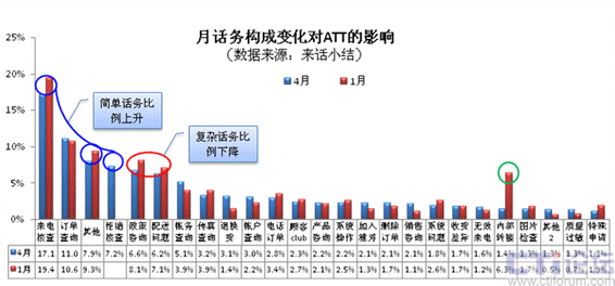 為了分析“話務(wù)構(gòu)成”和“業(yè)務(wù)周期”影響ATT的關(guān)聯(lián)性,我們還是取08年1月和4月的來話小結(jié)分布比例占前5位的數(shù)據(jù),進(jìn)行參考分析:(下圖11)