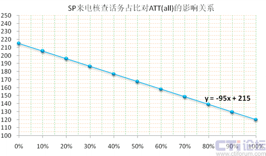 我們把話務(wù)構(gòu)成簡單化,假設(shè)只有“來電核查”和“Inbound”兩大隊(duì)列,在上下6%的波動范圍內(nèi),取ATT(sp)=120秒,ATT(in)=215秒,“SP來電核查”話務(wù)占比=x,則“Inbound”話務(wù)占比=1-x,ATT(all)=y(tǒng),整體通話均長y與“SP來電核查”話務(wù)占比x存在如下線性關(guān)系:(下圖13)