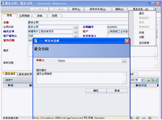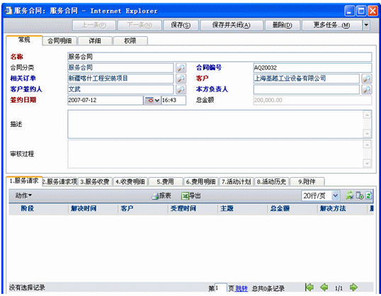 服務(wù)合同是也分為兩種,一種是非公司項目的服務(wù)請求此時沒有與訂單關(guān)聯(lián);二種是公司項目后服務(wù)請求,此時可以關(guān)聯(lián)訂單也可以不關(guān)聯(lián)訂單,如果關(guān)聯(lián)訂單就可以將訂單產(chǎn)品明細導(dǎo)入合同明細中(導(dǎo)入明細是可以調(diào)整數(shù)量和價格的).