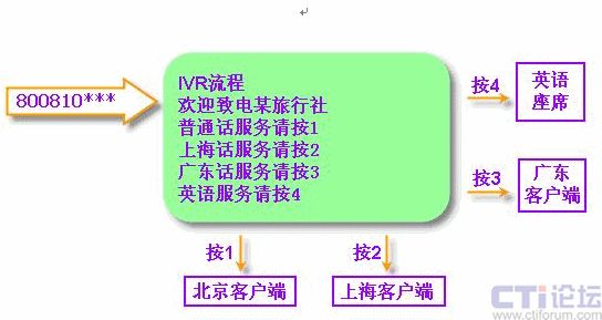 當(dāng)客戶撥打電話進(jìn)入SA800系統(tǒng)平臺(tái)的呼叫中心。通過IVR導(dǎo)航,可隨意打到各地的客戶端,再通過客戶端進(jìn)行更加細(xì)致的分類。并且,每個(gè)客戶端都可以互相轉(zhuǎn)接。IVR流程可以無限下拉菜單。