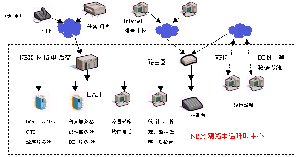 呼叫中心一般又稱為客戶服務(wù)中心,指企業(yè)或團(tuán)體通過公開一個電話特服號碼(如:12315、95000等),提供對客戶的電話服務(wù)。NBX網(wǎng)絡(luò)電話呼叫中心是基于3Com 公司NBX網(wǎng)絡(luò)電話交換機(jī)平臺構(gòu)筑的新一代語音、數(shù)據(jù)兩網(wǎng)合一的統(tǒng)一呼叫中心系統(tǒng),支持統(tǒng)一消息服務(wù),統(tǒng)一外部訪問路由,是各類傳統(tǒng)呼叫中心的升級換代產(chǎn)品。