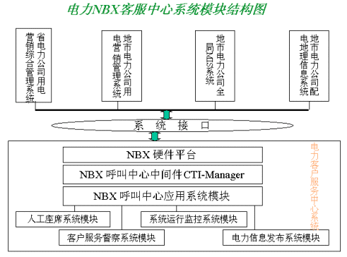 該方案以美國3COM公司的NBX產(chǎn)品為系統(tǒng)平臺,結(jié)合其配套的中間件產(chǎn)品CTI-Manager和上層第三方專業(yè)的電力行業(yè)應(yīng)用系統(tǒng),為各省、市電業(yè)公司建立起新型的電力呼叫中心(Call Center)。使電力客服中心系統(tǒng)以呼叫中心為基礎(chǔ),以電力系統(tǒng)其他后方資源信息(CIS,DMS,負(fù)控等系統(tǒng))為依托,為客戶提供電話、傳真、郵件、Internet等多種接入方式,通過和電力其他業(yè)務(wù)系統(tǒng)有機(jī)的結(jié)合,滿足客戶不同層次、個性化與多樣化的業(yè)務(wù)需求,提供了包括錄音、會議電話、統(tǒng)一消息和智能路由在內(nèi)的多種功能。