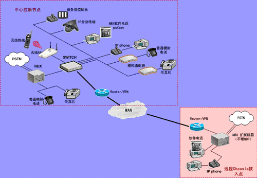 遠(yuǎn)端也可以有單獨(dú)的 IP 話機(jī)(不需要 NBX 呼叫處理器)接入系統(tǒng)。