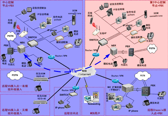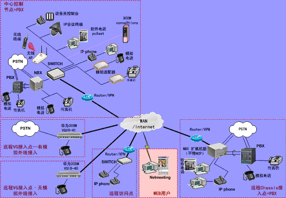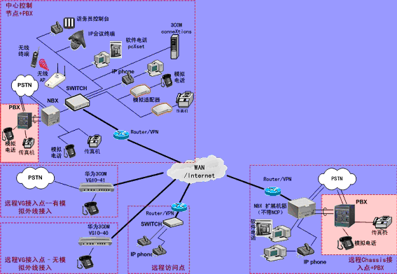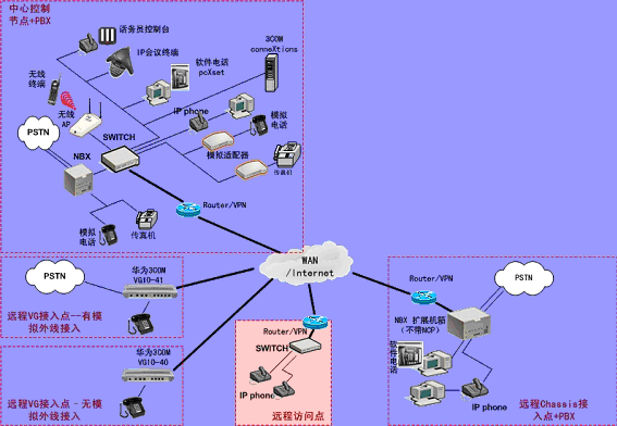 ③.遠(yuǎn)程接入的辦公室不再需要專用的 PBX, 只需要將3Com NBX電話終端接入到WAN網(wǎng)中,就能地實(shí)現(xiàn)在WAN或Internet上與3Com NBX 網(wǎng)絡(luò)電話系統(tǒng)的互連。