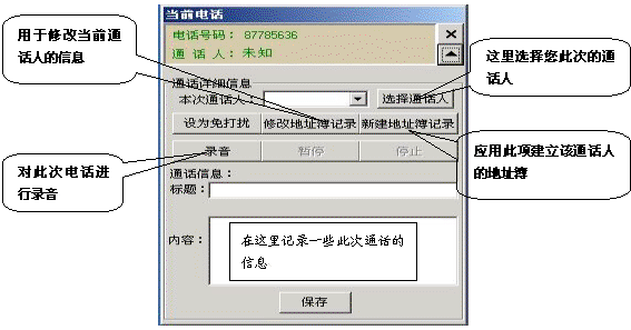 如果有電話打入時(shí),在屏幕的右側(cè)會彈出一個(gè)對話框,它顯示了當(dāng)前來電的號碼和通話人(如果在地址簿中沒有記錄則顯示為未知),點(diǎn)擊彈出全部菜單功能,它相當(dāng)于一個(gè)功能強(qiáng)大的通話記事本,用它既可以邊接聽電話邊整理相關(guān)通話的文字記錄,又可以錄下通話的全部內(nèi)容。如果這個(gè)電話是您不愿接聽的,也可以將它設(shè)置為“免打擾”,這樣,這個(gè)號碼以后將存入免打擾名單中,若此號碼再呼入,系統(tǒng)將自動掛斷此呼叫。如果這個(gè)電話是您認(rèn)為的重要客戶打過來的,您也可以將此號碼添加到重要客戶組中,以便您今后接聽或設(shè)置電話轉(zhuǎn)移時(shí)能與其它呼入電話相區(qū)分。
