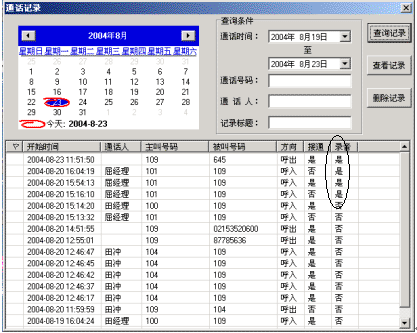 當(dāng)您在接打電話時(shí),可以利用 NBX-TCA對當(dāng)前的通話進(jìn)行錄音,以方便您對重要信息的記錄和查找。您可以在通話記錄中對已錄音的記錄進(jìn)行查找,如下圖所示。打開通話記錄,選擇按錄音查找方式查看已有的錄音即可。