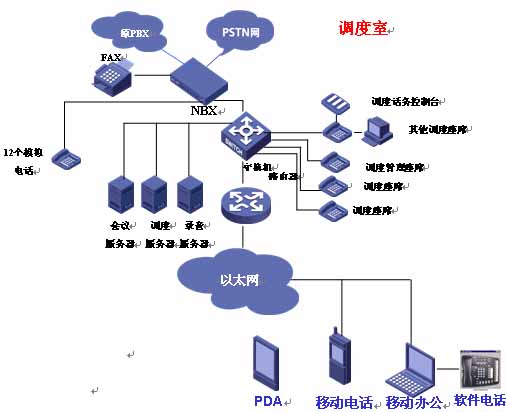 北京市交通應(yīng)急指揮中心,此次項(xiàng)目采用了1500個(gè)設(shè)備容量的華為3Com V3000 NBX系統(tǒng)一臺(tái)為核心語(yǔ)音調(diào)度交換機(jī),連接PSTN網(wǎng)。使用3101標(biāo)準(zhǔn)版IP智能話(huà)機(jī)、3102商務(wù)版IP智能話(huà)機(jī)和3105話(huà)務(wù)臺(tái)總數(shù)量達(dá)到了34部。在已有的網(wǎng)絡(luò)結(jié)構(gòu)中實(shí)施語(yǔ)音系統(tǒng),減少對(duì)網(wǎng)絡(luò)基礎(chǔ)設(shè)施的投資,節(jié)省話(huà)路設(shè)備成本、電話(huà)系統(tǒng)安裝、維護(hù)和使用管理,還可提供更多的通信業(yè)務(wù)和更強(qiáng)的智能語(yǔ)音功能。結(jié)構(gòu)圖如下: