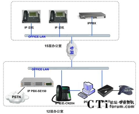 隨著企業(yè)規(guī)模的不斷擴展,公司在15層新增約50人的辦公區(qū),需要和12層實現(xiàn)內(nèi)部通訊免費(直撥分機號碼),出局路由沿用現(xiàn)有ISDN線路,F(xiàn)有的傳統(tǒng)的集團電話設備已經(jīng)滿配,無法適應企業(yè)規(guī)模的擴張,無法跨地域組網(wǎng),不能建立多點分布式的內(nèi)部電話系統(tǒng),不能充分利用現(xiàn)有的IP網(wǎng)絡資源發(fā)展有助于提高企業(yè)競爭力的網(wǎng)絡增值業(yè)務。