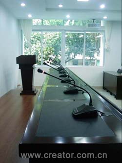 所以在本會議室配置了1臺標準的會議討論型控制主機臺CR-M4101,1臺座式的主席機CR-M4102B,9臺座式的會議代表機CR-M4104B,另外還有連接電纜等。主席機具優(yōu)先控制權(quán),設(shè)置主席位置,并且可以移動,代表機分別設(shè)置其余數(shù)個話筒點。采用手拉手方式,一條總線即可連接所有會議討論設(shè)備,布線簡單快捷。通過專業(yè)的音頻輸出口和音響擴聲系統(tǒng)結(jié)合,清晰、明亮的將發(fā)言人的聲音重放出來。