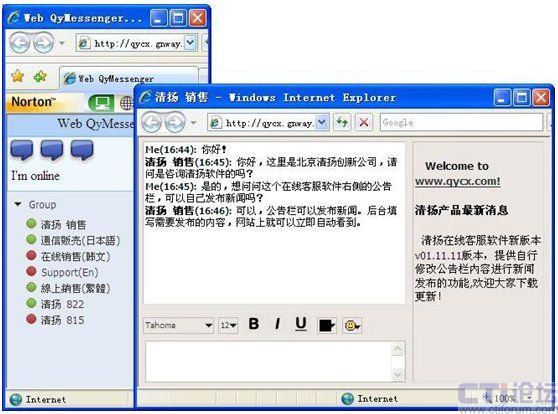 Web即時(shí)通信,對任意地方的客戶,是用IE即可以訪問"對話"。所以,它虛擬出一個(gè)銷售人員的接觸途徑。