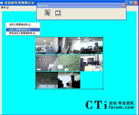 在大多數人的印象里,使用軟件進行視頻會議時所顯示的圖像無論是大小還是顯示的位置都是固定的,無法改變。即使是顯示整個會場,也只能是把全部的圖像都顯示在一個固定的對話框中。而軟件屏幕墻定制的功能,可以隨意的對整個會場進行布局,如屏幕墻的背景,名稱,圖像的位置,大小。