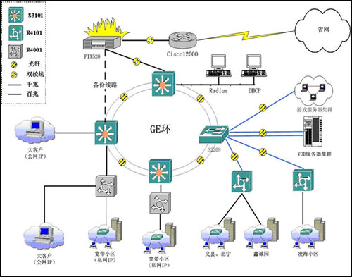 此城域網(wǎng)結(jié)構(gòu)清晰,由核心層的三層交換機只負責數(shù)據(jù)的快速轉(zhuǎn)發(fā),對業(yè)務匯聚和用戶的認證控制任務全部由接入服務器R4000來完成。要求接入服務器支持多種認證手段、加強對各類用戶實現(xiàn)不同級別的控制、為用戶的訪問提供安全保障措施、結(jié)合Radius系統(tǒng)提供多種計費功能。