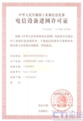 CTI論壇(ctiforum)05月15日消息: 日前從深圳市震有科技有限公司傳出消息,公司自主研發(fā)的NuBiz NC5200 IP電話網(wǎng)關設備順利通過工業(yè)和信息化部電信設備認證中心的審核,取得“電信設備進網(wǎng)許可證”。此舉標志著震有科技的NuBiz交換產(chǎn)品已成功取得進入國家電信網(wǎng)的資質,為大規(guī)模電信級推廣應用打下了基礎。