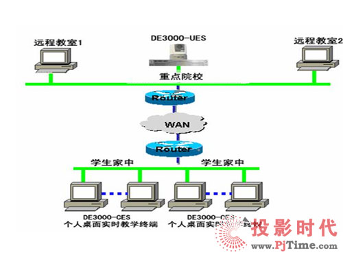 如上圖所示:DE3000系列中的DE3000-CES(個人桌面實時教學終端)主要用于學生在家里的PC上與學校的老師進行實時的面對面授課。在學校的多媒體教室配備DE3000-UES(遠程教育終端設備),在學生家中的電腦上安裝DE3000-CES(個人桌面實時教學終端),即可實現(xiàn)遠程實時授課,其高質(zhì)量的音視頻效果與強大的數(shù)據(jù)功能,使學生猶如坐在教室里上課一樣,可體現(xiàn)出強烈現(xiàn)場感。