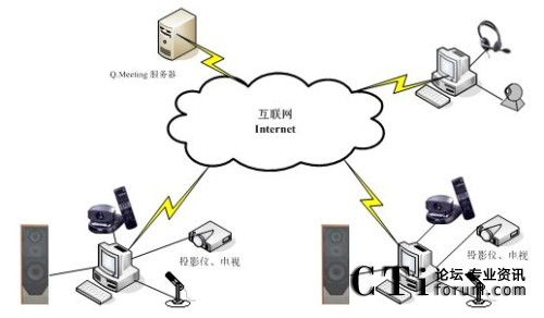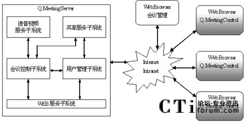 系統(tǒng)選用北京億方連線(xiàn)通訊技術(shù)有限公司具有國(guó)際先進(jìn)水平的全新第四代網(wǎng)絡(luò)視頻協(xié)作會(huì)議中心Q.Meeting為核心進(jìn)行構(gòu)建,該系統(tǒng)由會(huì)議服務(wù)器Q.Meeting Server和基于IE 瀏覽器的客戶(hù)端組成。Q.Meeting Server運(yùn)行于一臺(tái)服務(wù)器上,構(gòu)成網(wǎng)絡(luò)會(huì)議中心,提供會(huì)議控制、視頻服務(wù)、語(yǔ)音服務(wù)、共享服務(wù)、WEB服務(wù)和會(huì)議用戶(hù)管理等功能。所有參加會(huì)議的人員只需通過(guò)IE瀏覽器訪(fǎng)問(wèn)會(huì)議中心網(wǎng)站就可以參加會(huì)議,通過(guò)訪(fǎng)問(wèn)會(huì)議頁(yè)面和嵌于其中的客戶(hù)端插件Q.Meeting Control實(shí)現(xiàn)音頻和數(shù)據(jù)共享等交流。