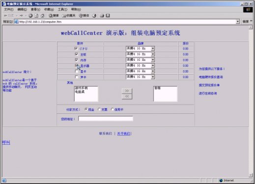 給基于交換機(jī)的呼叫中心,配備Web協(xié)作服務(wù)器和客戶端、座席端軟件包,使得利用PC上網(wǎng)的客戶可以通過因特網(wǎng)呼叫交換機(jī)中的組,使得應(yīng)答的座席,可以和客戶進(jìn)行實(shí)時(shí)文字交談、護(hù)航瀏覽、表單共享和共享白板。