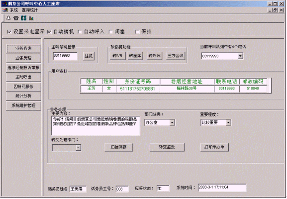 客戶打入電話后,當系統(tǒng)的自動語音應答子系統(tǒng)無法解決客戶問題時,客戶可選擇人工服務(wù),由企業(yè)客戶服務(wù)代表直接接聽客戶電話,處理并解決客戶問題。此時客戶同座席話務(wù)人員直接溝通,并同時記錄下該客戶的聯(lián)系方式,將相關(guān)數(shù)據(jù)添加入系統(tǒng)數(shù)據(jù)庫;也可以在數(shù)據(jù)庫的支持下回答接受查詢卷煙/價格/限額/新品種、卷煙經(jīng)營規(guī)范制度/卷煙專賣政策法規(guī)咨詢、通報最近暢銷卷煙的限額情況/通報最近增加的新品種/煙草公司召集的活動通知、投訴和舉報違法經(jīng)銷行為、卷煙預訂、電話訪銷、滿意度調(diào)查等。