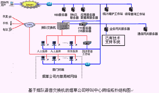 該煙草公司呼叫中心主要是由語音交換機、CTI服務(wù)器、IVR(交互式語音應答)/IFR(交互式傳真應答)子系統(tǒng)、人工座席子系統(tǒng)、應用服務(wù)器、數(shù)據(jù)庫服務(wù)器、業(yè)務(wù)網(wǎng)關(guān)子系統(tǒng)、通信網(wǎng)關(guān)子系統(tǒng)等硬件設(shè)備和應用軟件組成。