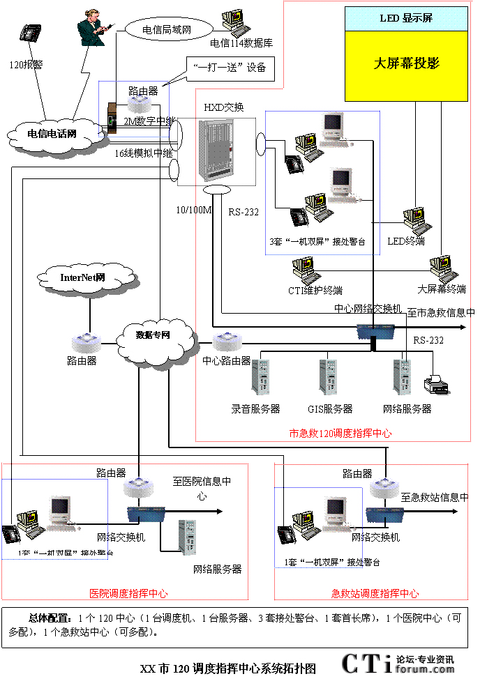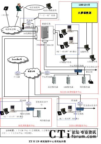 - 樹立大網(wǎng)絡(luò)概念:采用先進(jìn)的通訊、計算機(jī)網(wǎng)絡(luò)技術(shù)(如CTI技術(shù)),利用現(xiàn)有的通信資源,實(shí)現(xiàn)市人民醫(yī)院120指揮中心與急救分站的計算機(jī)網(wǎng)絡(luò)及相關(guān)領(lǐng)導(dǎo)辦公室計算機(jī)大聯(lián)網(wǎng);形成全市范圍內(nèi)120有線、無線全方位立體調(diào)度語音通道大網(wǎng);為今后督查聯(lián)網(wǎng)、大聯(lián)動打下基礎(chǔ)。