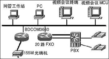 通過在BDCOM3660路由器上配置相應(yīng)的CE1、語音等功能模塊,中心20個E1接口可通過SDH連接17個地市氣象局和重要的氣象站(共20個),同時可供20部電話用以VoIP通話;中心BDCOM3660路由器每臺配兩個10/100M以太網(wǎng)端口,使得數(shù)據(jù)和視頻分開,防止網(wǎng)絡(luò)的廣播風(fēng)暴。