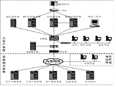 DW/OLAP服務(wù)器具有數(shù)據(jù)的采集、分析等功能,通信服務(wù)器主要實(shí)現(xiàn)大客戶(hù)管理系統(tǒng)與外部系統(tǒng)的接口及轉(zhuǎn)換,Web服務(wù)器則支持軟件B/S模式的實(shí)現(xiàn)。其它設(shè)備則包括網(wǎng)管工作站(如:HP