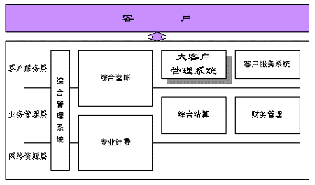綜合電信業(yè)務(wù)服務(wù)支撐系統(tǒng)由專(zhuān)業(yè)計(jì)費(fèi)、綜合營(yíng)帳、綜合客服、綜合結(jié)算和統(tǒng)一客戶(hù)資料等系統(tǒng)組成。其中的大客戶(hù)服務(wù)系統(tǒng)是電信運(yùn)營(yíng)商面向大客戶(hù)提供服務(wù)的接口,通過(guò)大客戶(hù)市場(chǎng)開(kāi)拓、大客戶(hù)信息收集及管理、大客戶(hù)服務(wù)及營(yíng)銷(xiāo)、企業(yè)決策支持等一系列的活動(dòng),實(shí)現(xiàn)方便、快捷、高品質(zhì)的大客戶(hù)服務(wù)。